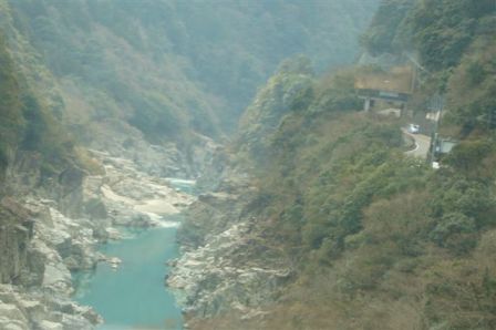 特急しまんと号で高松駅から高知駅に向う。途中、山々に囲まれ、源流である吉野川の流れる大歩危・小歩危地域を列車が通る。急斜面の絶壁の山々に囲まれた川の織りなす自然のすごさに驚く。