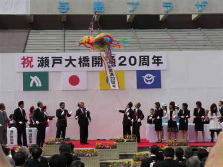 夢の架け橋とうたわれた本四架橋。そのトップを切り、1988年4月10日瀬戸大橋が開通して20年。本日「瀬戸大橋開通20周年記念式典」が香川県坂出市与島町の瀬戸大橋与島パーキングエリア 与島プラザにて盛大に開催された。