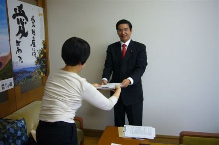 15時には知的障害者(社団法人)「全日本手をつなぐ育成会」副島宏克理事長・大久保常明常務理事が来訪。「障害者虐待防止法」早期制定への要望書を持参され、懇談を進める。