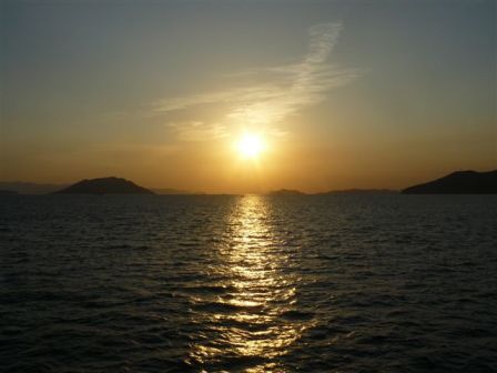 夕方のフェリーで高松港へ。夕日が美しく瀬戸内海に映える。
