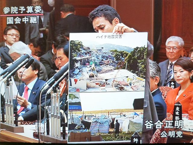 またハイチ地震の対応は現地視察したパネルを使い、岡田外務大臣に質問。現場を訪問した緊迫感が伝わる。