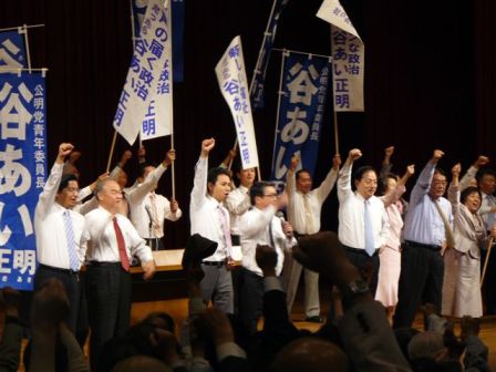 高松での朝。高松駅前・ことでん高松築港駅で、街頭演説。 「今、日本の政治がひどい!」 『鳩山民主党政権の迷走の沖縄・強行の郵政・後手の口蹄疫・弱者切捨ての福祉(難病・B型肝炎)。』等を強く訴える。 手を振って、応援いただく。国民の怒りと政治不信は頂点に。 午後からは、徳島県に移動。「谷あい正明後援会総会」に参加。 阿波の皆様の谷あい正明応援のエールがすごい。 長尾県代表の後、あいさつ。 谷あい正明の抱負の後は、太田全国代表者会議議長が鳩山民主党政権をめった切り。全員で勝利の勝ち鬨。 夜は香川県多度津町で、懇談会。内田丸亀市議とも支援拡大でまわる。 共有: Facebook で共有するにはクリックしてください (新しいウィンドウで開きます) Facebook クリックして X で共有 (新しいウィンドウで開きます) X 関連