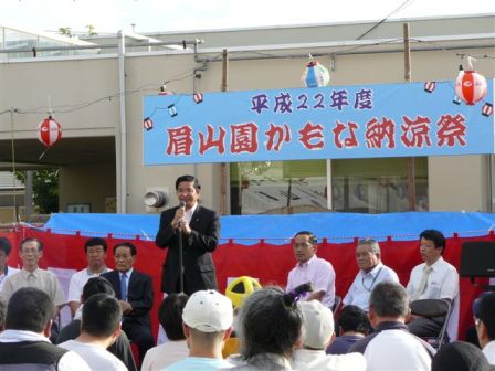 夕方、徳島市内の障がい者施設の平成22年度「眉山園・かもな納涼祭」に出席させていただき、開会式で挨拶。