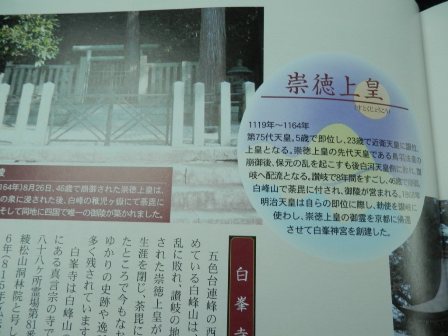 ・1156年、保元の乱に敗れた崇徳(すとく)天皇は讃岐国(現:香川)に配流。そして、1164年四十六歳で崩御せられるまでの約9年間をこの地(坂出市)でお過ごしになlられ、崇徳上皇の御遺跡は坂出市に数多く残っている