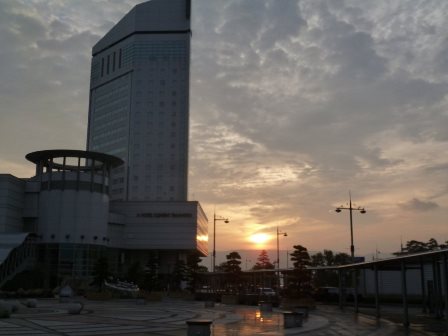 朝5時35分のマリンライナー号で高松駅を出発。旭日が眩しく駅前を照らし、瀬戸内海の景色に心癒される。