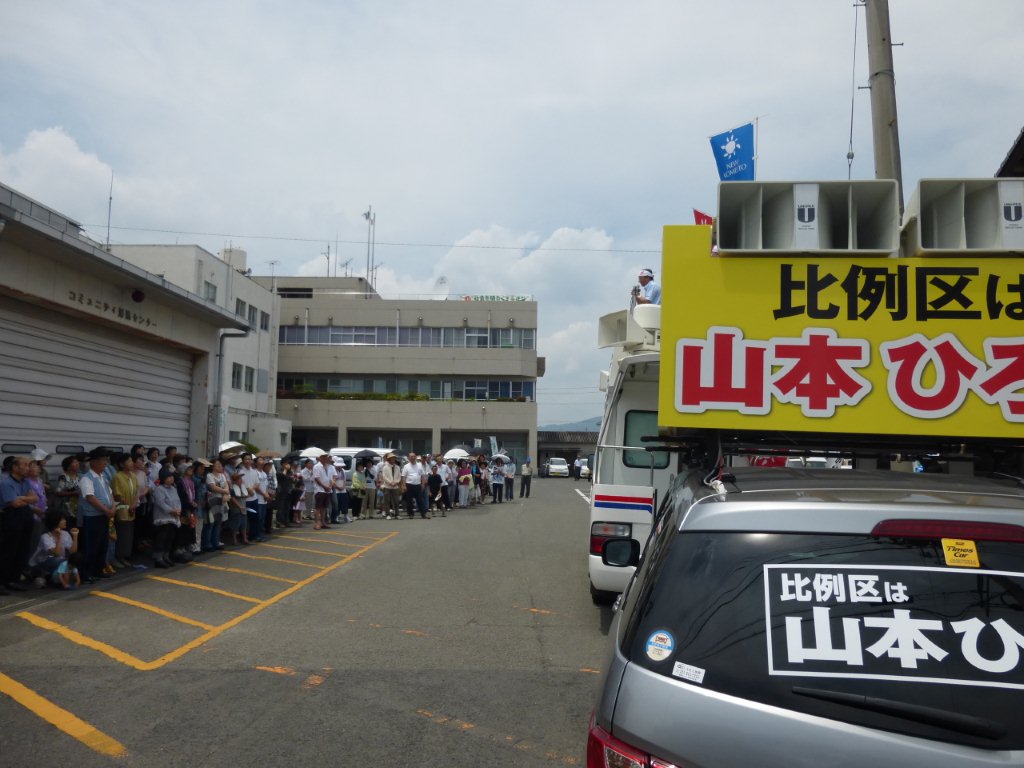 本日は早朝高松市の朝礼からスタート。 午前中、香川県3か所での街頭演説。場所は、高松市(高松中央公園)、さぬき市(さぬき市役所)東かがわ市(三本松交差点) 全ての街頭には、斉藤鉄夫幹事長代行・石田のりとし四国議長が応援に来られました。 重大局面の比例区。山本ひろし・渾身の訴えを!お願いしました。 炎天下、大勢の皆様が熱いエールをおくっていただき、大変にありがとうございました。 後6日、死力を尽くして闘います。 共有: Facebook で共有するにはクリックしてください (新しいウィンドウで開きます) Facebook クリックして X で共有 (新しいウィンドウで開きます) X 関連