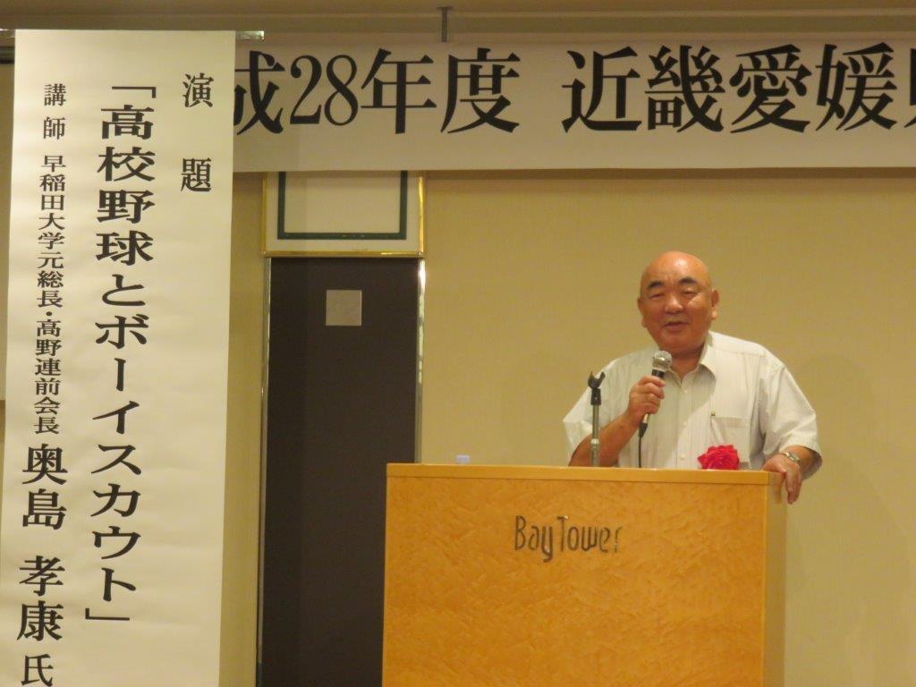 講演会は愛媛県鬼北町出身の早稲田大学元総長・高野連前会長の奥島孝康氏。『高校野球とボーイスカウト』のテーマで、示唆に富む内容で、さらに聞きたい内容でした。