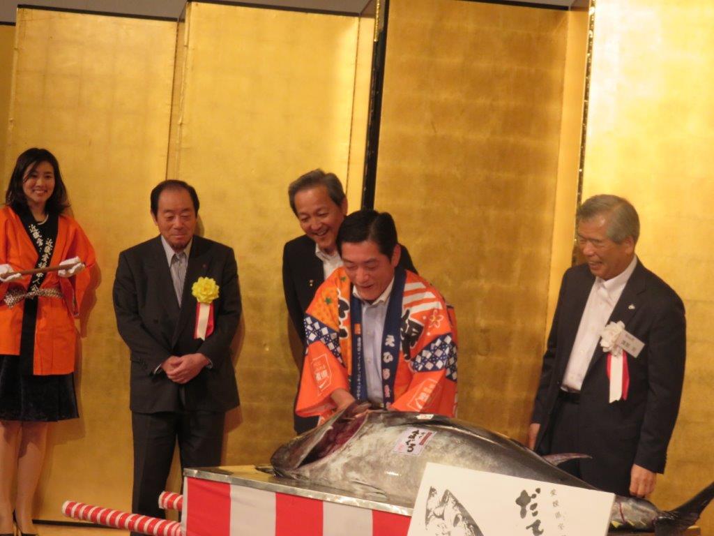渡部会長は今回で13年目。近畿県人会の大きな発展へ、多大な貢献をされておられます。えひめ産マグロ解体ショー(大起水産マグロチーム)・えひめさんさん踊りといつも楽しい企画です。
