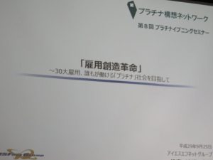 25日夕方、三菱総合研究所にて「第8回プラチナイブニングセミナー」に出席。アイエスエフネットグループ 代表 渡邊 幸義氏の講演を伺いました。テーマは『雇用創造革命 ~30大雇用、誰もが働ける「プラチナ社会」を目指して』。