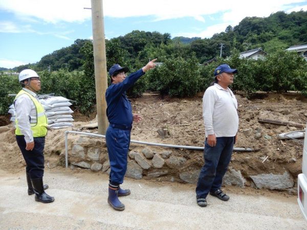 中島の急傾斜地では、至る所で土砂崩れが発生。畑に通じる農道が寸断。水を園地に運ぶパイプライン等も多数破損。