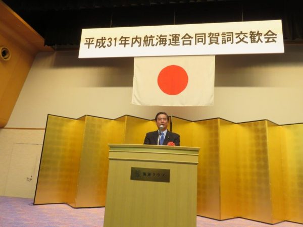 17日夜、平成31年内航海運合同賀詞交歓会が海運ビルにて盛大に開催されました。日本内航海運組合総連合会(小比加会長)及び会員5組合合同の賀詞交歓会。小比加会長挨拶。石井国土交通大臣の挨拶の後来賓として挨拶。