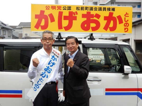 清水松山市議の司会。笹岡県代表と共に応援の演説。「かげおか としのり」候補は、正義感が強く、物事を冷静に判断するバランス感覚の持ち主です。