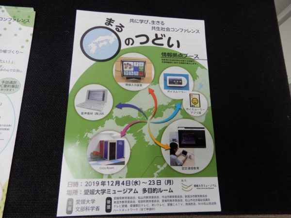 障がい者の生涯学習を支援する取組みや支援機器等に関する情報が展示されている「情報拠点ブース」を見学。愛媛大学教育学部 苅田知則先生に案内いただきました。