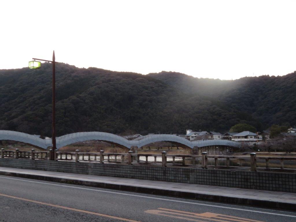 会場から錦帯橋がすぐ見えます。今5年毎に実施している錦帯橋の保全工事が始まっており、保護シートで囲まれています。橋の通行は可能だそうです。