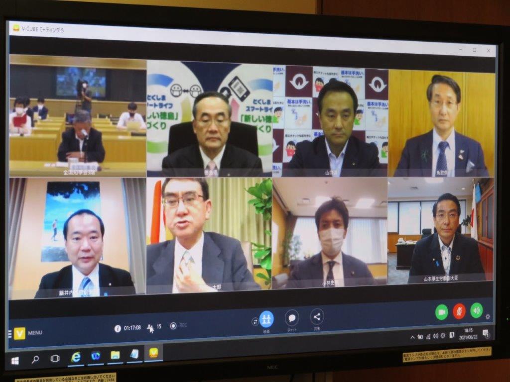 22日夜、新型コロナウイルスのワクチン接種をめぐり、全国知事会の飯泉会長(徳島県知事)らと河野規制改革担当大臣とオンラインでのテレビ会議を開催。