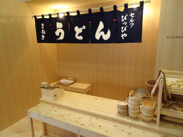 遊具やおもちゃには県産の木が多く使われています。入り口正面に入ると出迎えてくれるシンボルツリーはまんのう町産のヒノキ、その周りのラウンドテーブルにも塩江町産の木材が使われています。