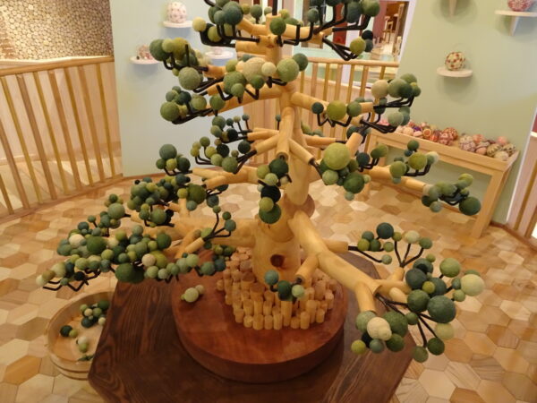 香川県内の職人が手がけた県産木材などを使った約5000点の玩具で遊ぶことができる同館。広さは1100平方メートル。おもちゃだけでなく、床などの内装も木製で、館内には木の香りが漂う。松葉に見立てた手まりで造形する盆栽のおもちゃや、小豆島のしょうゆ蔵で作られた木おけなど、多彩なおもちゃがあります。