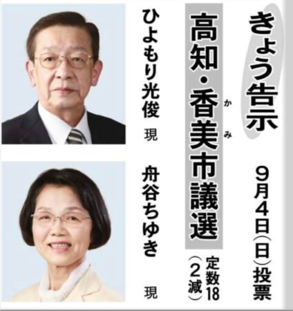 28日高知県香美市議選(9月4日投票)がスタート。公明党から「比与森みつとし」候補と「舟谷ちゆき」候補が出馬。
