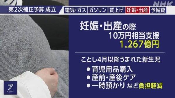 具体的には、ウクライナ危機に伴い上昇した電気・都市ガス料金、ガソリンなど燃料費の負担軽減に計6兆円超を計上。妊娠期からの伴走型相談支援と、妊娠・出産時に計10万円相当を給付する経済的支援を一体的に行う「出産・子育て応援交付金事業」に関する経費も充当しました。