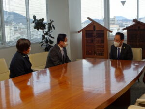 16日午前、香川県善通寺市の善通寺市役所にて辻村修市長、小瀧賢士副市長と懇談。 地元の真鍋範子市議が同席。善通寺市は妻の故郷で、私にとっても第2の故郷です。 「新型コロナ対策、物価高騰、地方創生など」で意見交換。 地方の現状など伺いました。国・市との連携で支援してまいります。 意見交換 辻村市長らと 共有: Facebook で共有するにはクリックしてください (新しいウィンドウで開きます) Facebook クリックして X で共有 (新しいウィンドウで開きます) X 関連