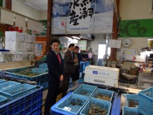 22日午後 故郷八幡浜市の「八幡浜みなっと」にある「どーや市場」へ。高校時代の同級生の店「黒潮水産」の篠崎仁志社長を訪問。原田大二郎予定候補が同行。