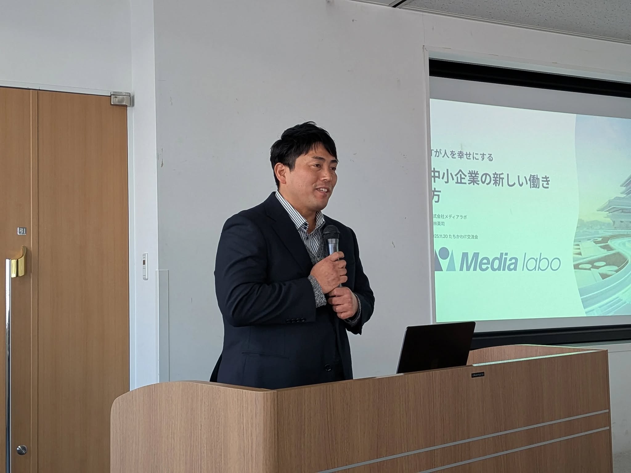 1.事業紹介 「ITが人を幸せにする〜中小企業の新しい働き方〜」TEAM MEDIA LABO 小林英司 氏。