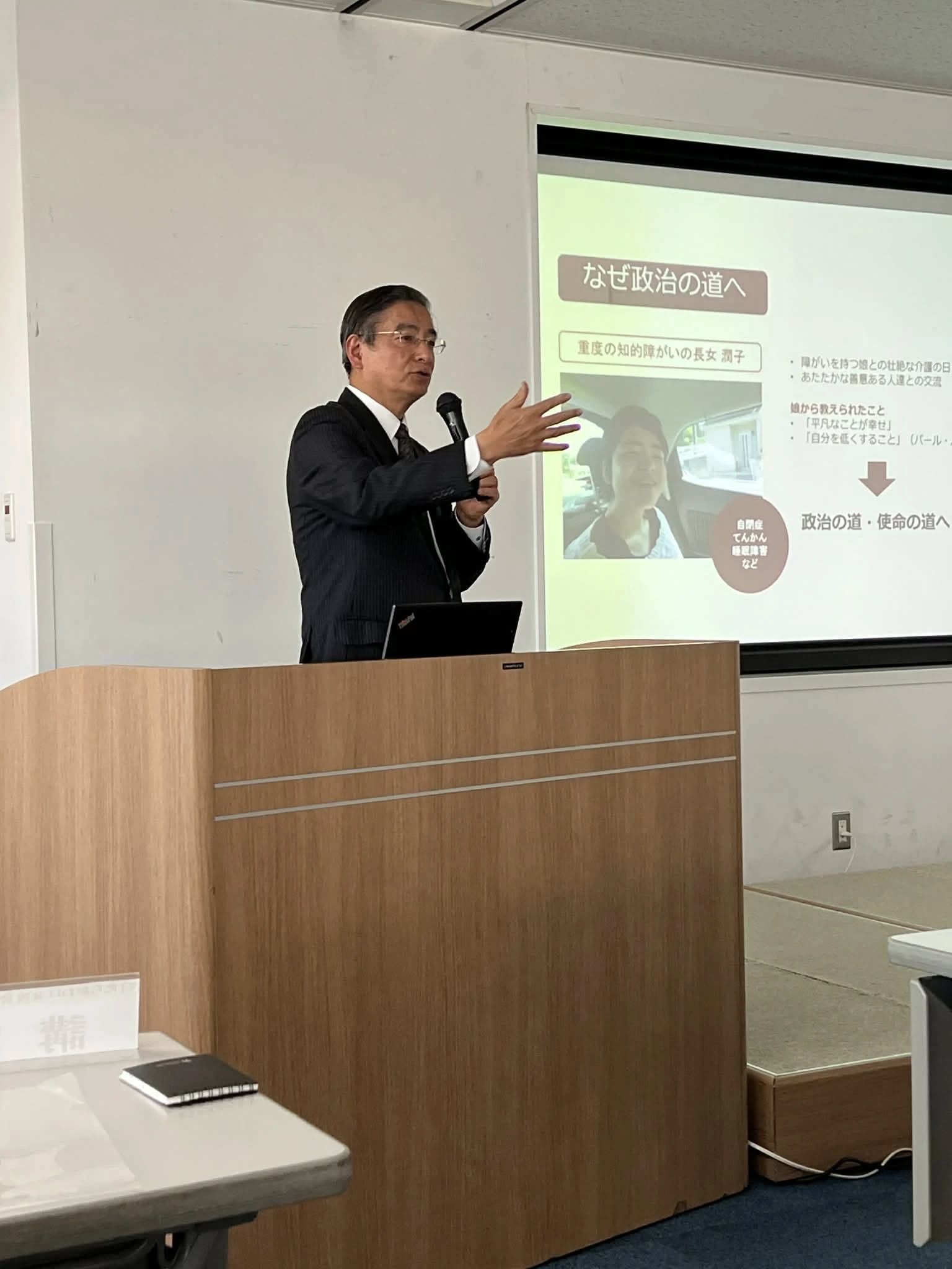 「自己紹介、3期18年間の障害福祉の推進状況、障害者雇用の施策、中小企業の支援、デジタル化による障害者就労など」私自身の体験、事例を交え、40分間話させていただきました。