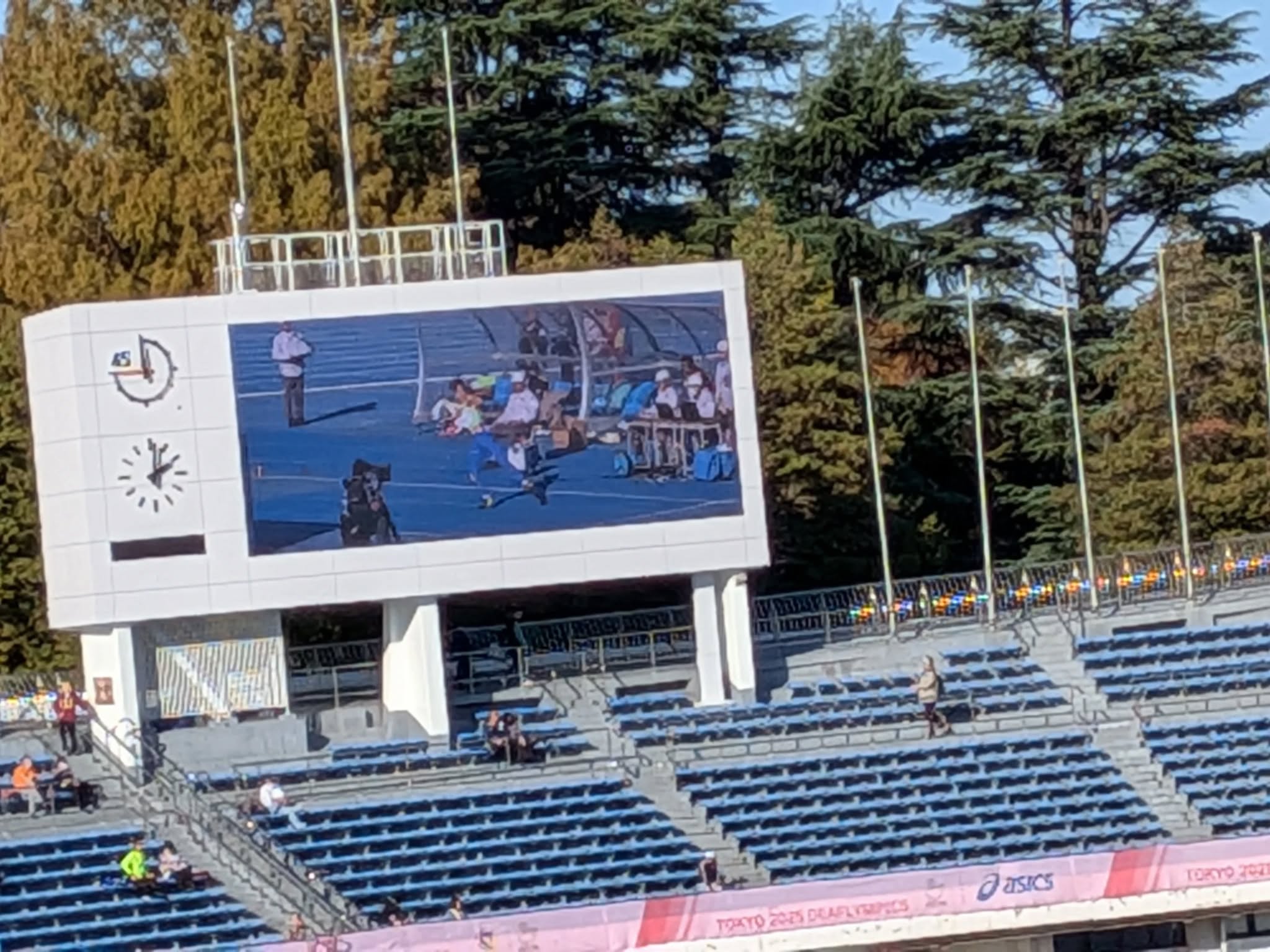 デフリンピックの陸上競技場ではやり投げ等が行われ、世界中から大勢の皆さんが観戦。いたる所で“手話の花"で交流され、皆さん幸せそうな笑顔の交流に心温まります。