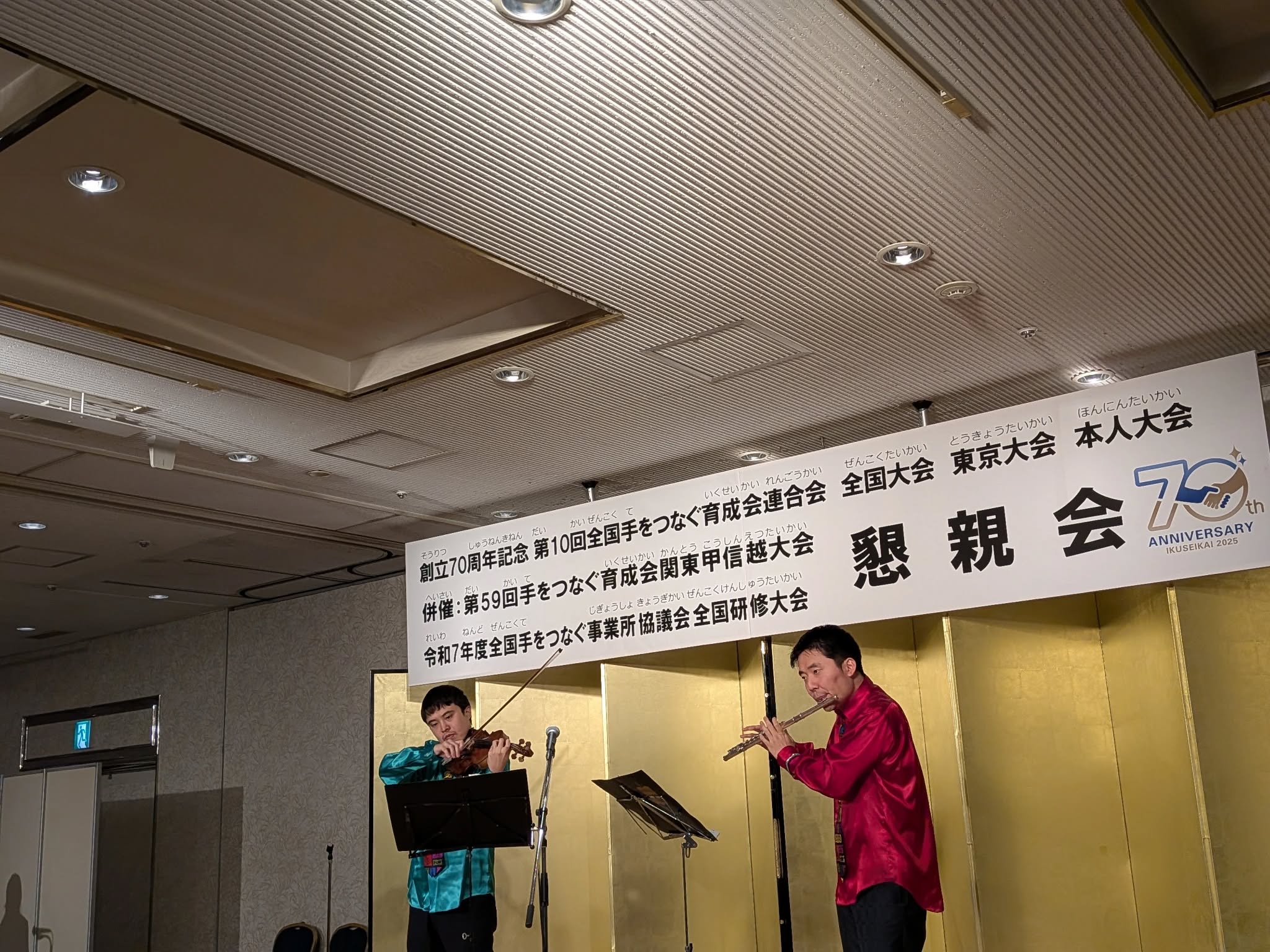 「ノブタク演奏」。本間惟彦さん(バイオリン)と小柳拓人さん(フルート・ピアノ)によるデュオの演奏。二人とも自閉症で普段は会社員として働きながら演奏活動を行っています。