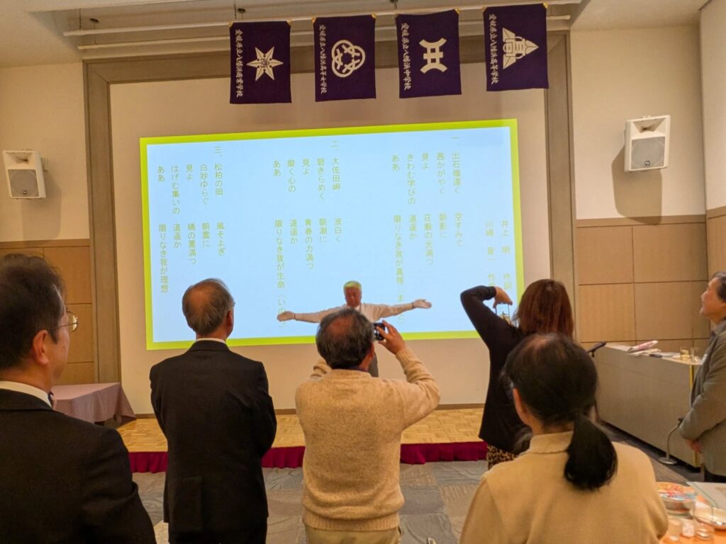 抽選のくじでは「日野出豚のっけごはん」が当たりました。最後は高校の校歌の大合唱。指揮は三好清隆先輩さん。中締めは木村同窓会長。