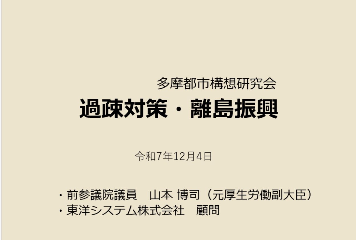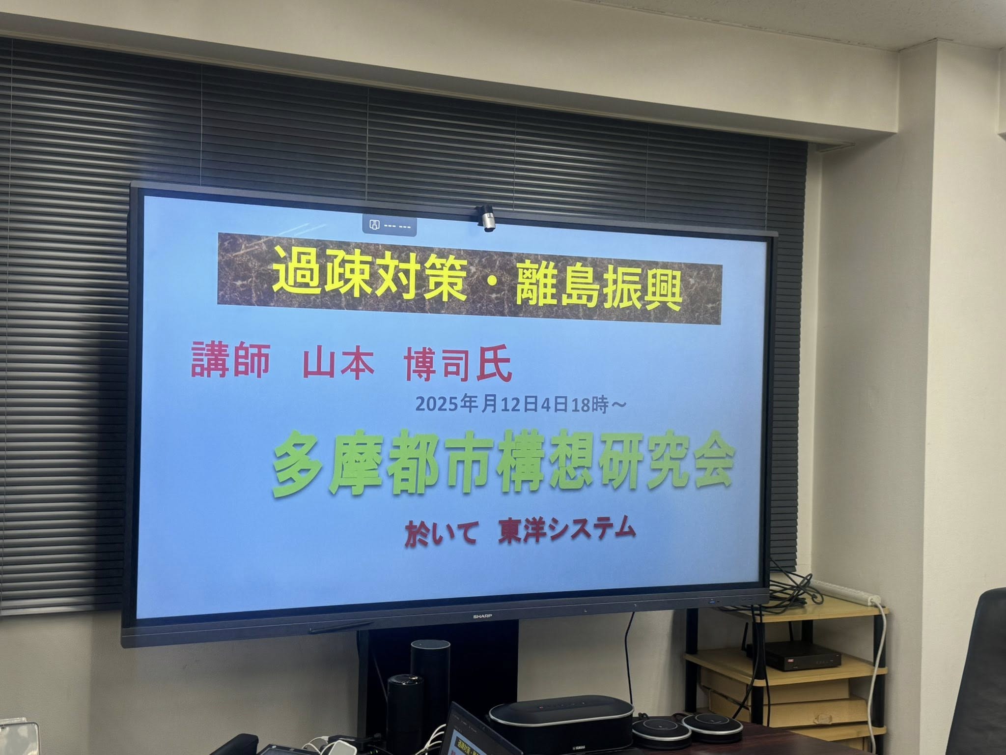 4日夕方、立川市にてNPO法人 多摩都市構想研究会の会合が開催され、講師として出席。「過疎対策・離島振興」について40分間講演致しました。