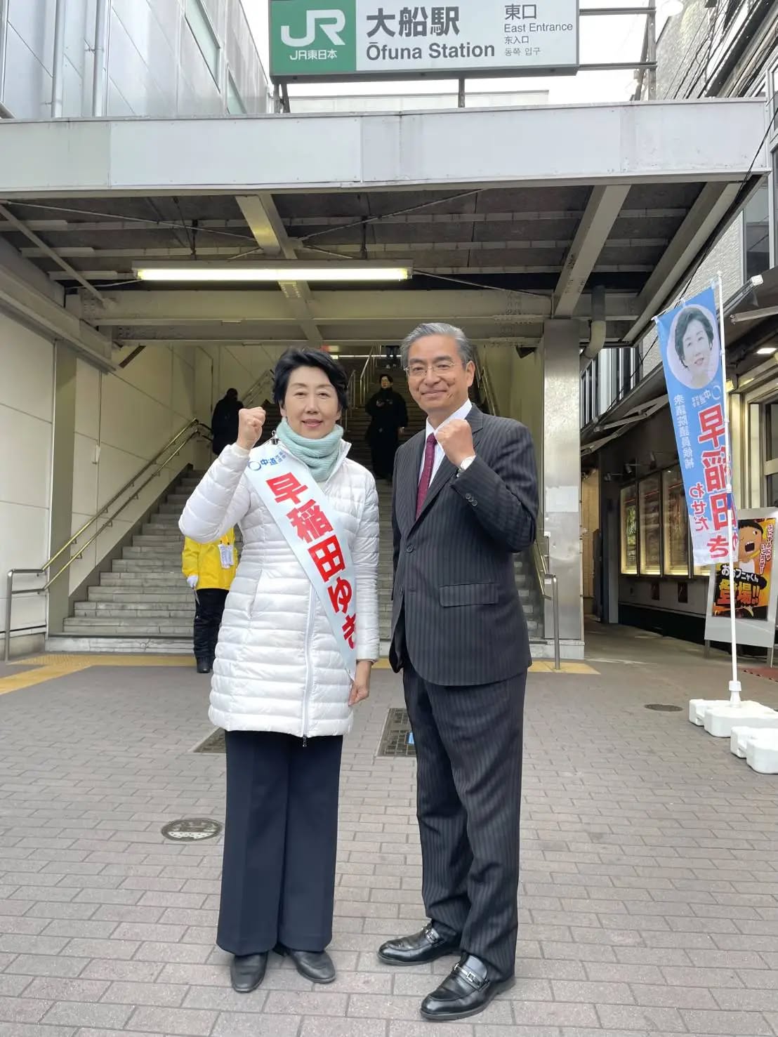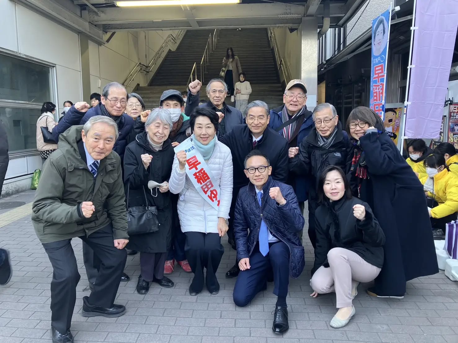 寒い中にもかかわらず、鎌倉市・逗子市地域から大勢の方々(慶應大学同窓の方々、故郷愛媛県の方、目黒時代お世話になった方、高次脳機能障害友の会の方々など)が約1時間。最後まで耳を傾けていただきました。「早稲田ゆき」候補と勝利に向けて一緒の写真も撮らせていただきました。ありがとうございました。心より感謝致します。