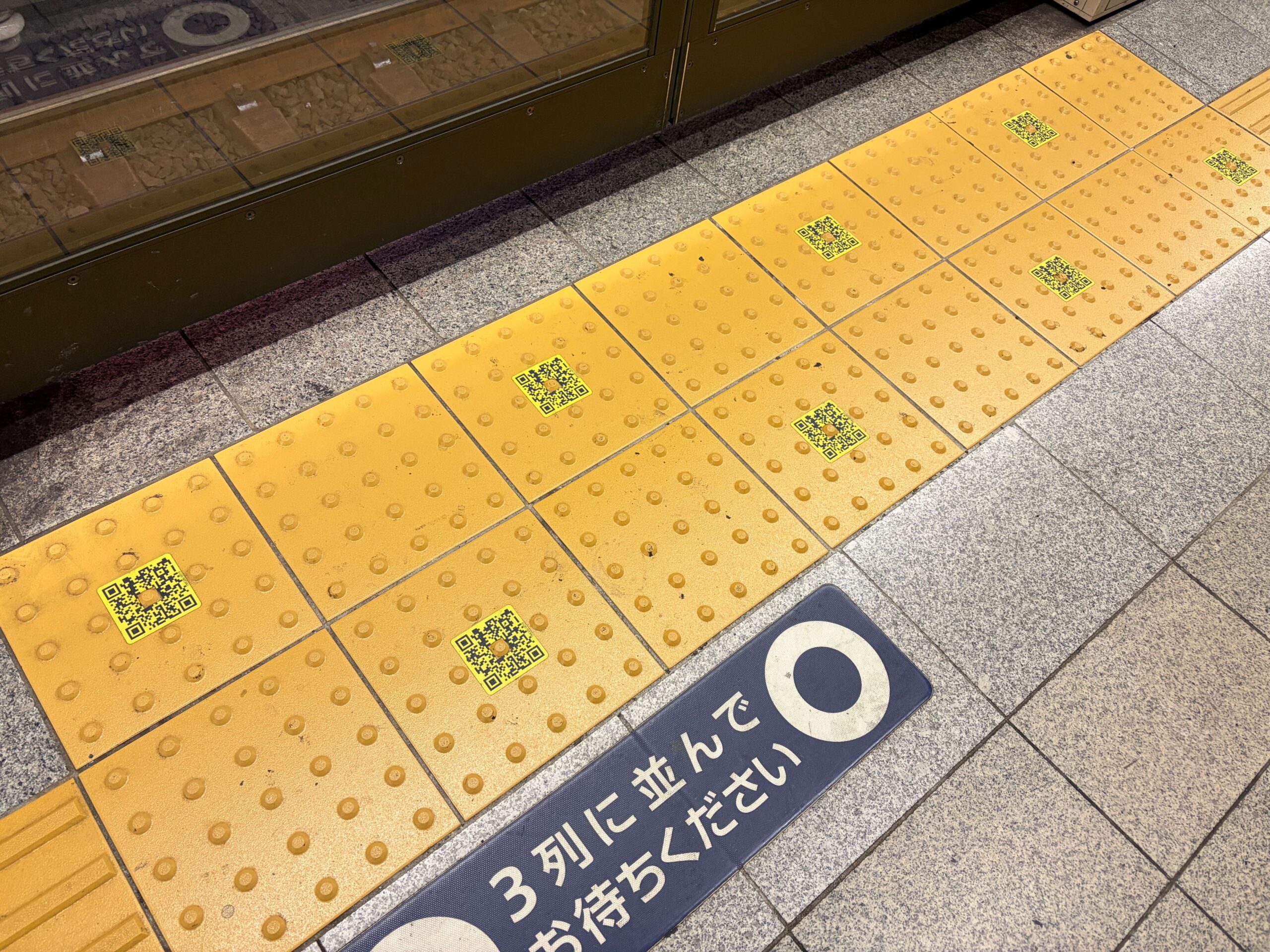 各QRコードには正確な位置情報が紐づけられており、視覚障がい者の方が迷うことなく、ホームから改札を通り出口まで向かうことを支援します。