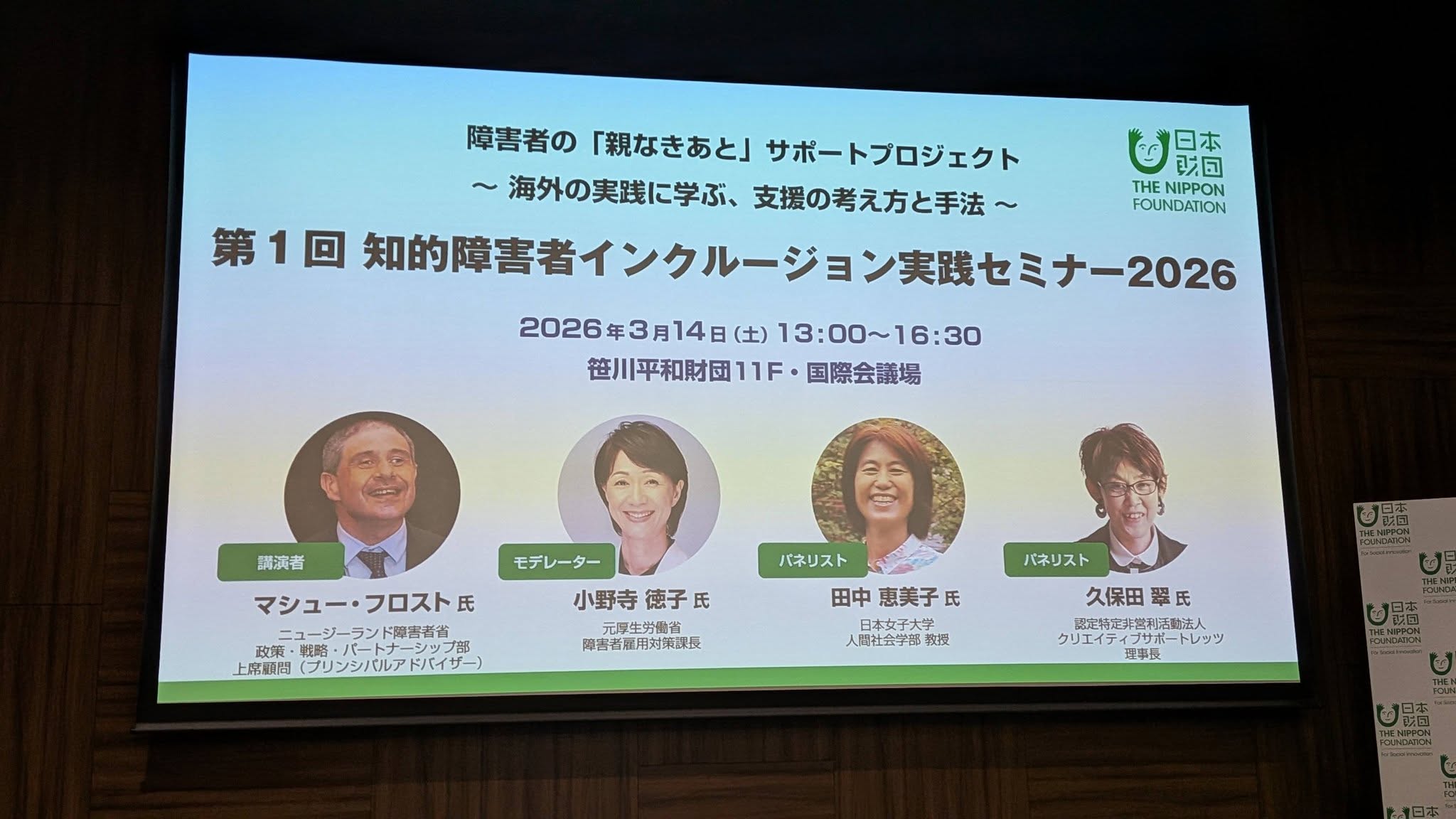 14日午後 港区の笹川平和財団ビル11階国際会議場にて「第1回 知的障害者インクルージョン実践セミナー2026」~知的障害者の社会参加について~が開催され、参加しました。主催は日本財団。