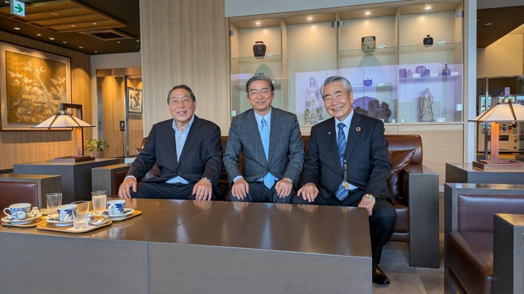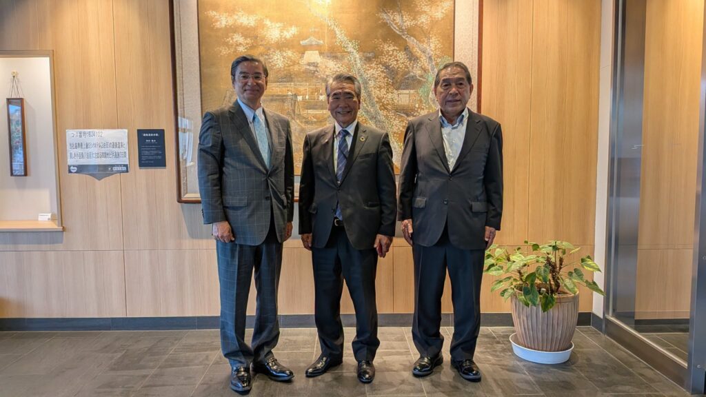 19日愛媛県松山市内にて、道後温泉旅館組合の新山富左衛門前理事長(ホテル古涌園遥会長)と懇談。公明党丹生谷利和県副代表(元市議)が同席。