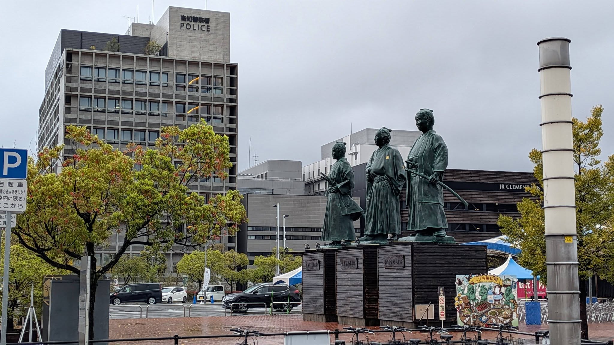 夕方を過ぎる頃からは、雨もおさまり、晴れ間も見えはじめ、高知駅前の観光広場「こうち旅広場」に位置する「土佐三志士像」へ。