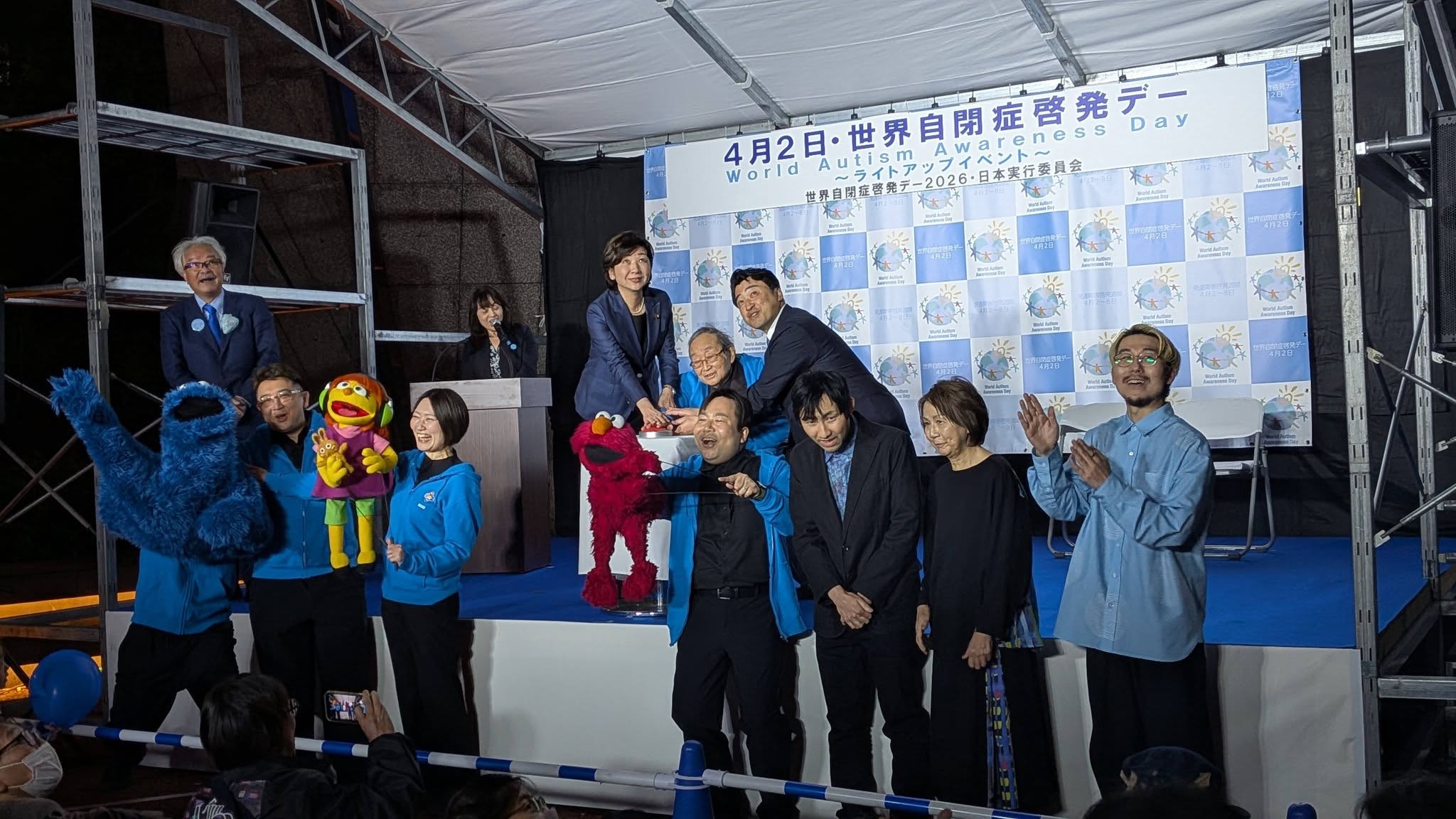 「セサミストリート」のキャラクターたち(自閉症の女の子ジュリアとその友達エルモ、クッキーモンスター)、HERALBONY(ヘラルボニー)やアーティストの方々も登壇。司会は国沢真弓さん(フリーアナウンサーで発達障がいファミリーサポートMarble代表理事)。
