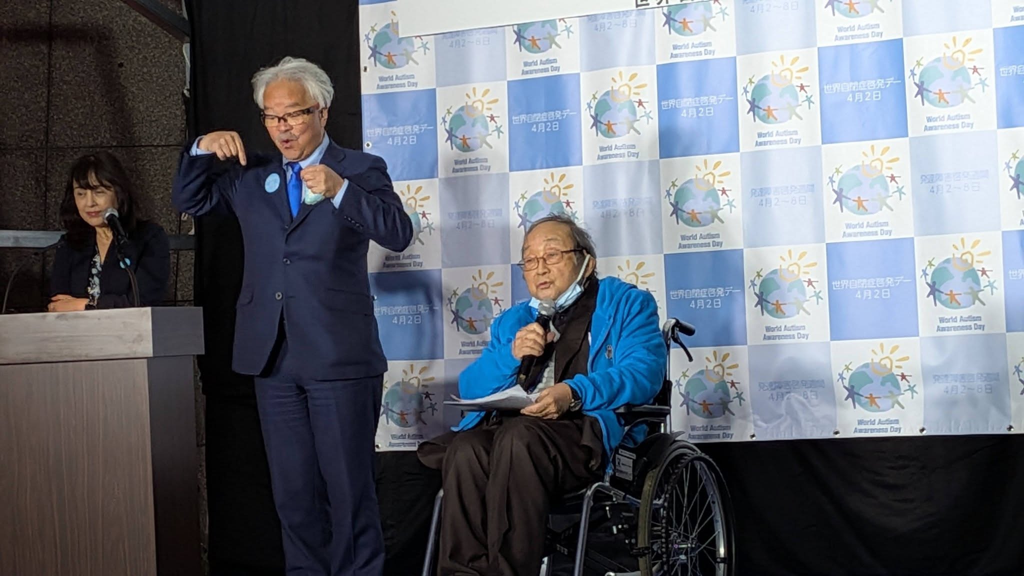 世界自閉症啓発デー・日本実行委員会 市川宏伸委員長(日本自閉症協会 会長)の挨拶の後、点灯。