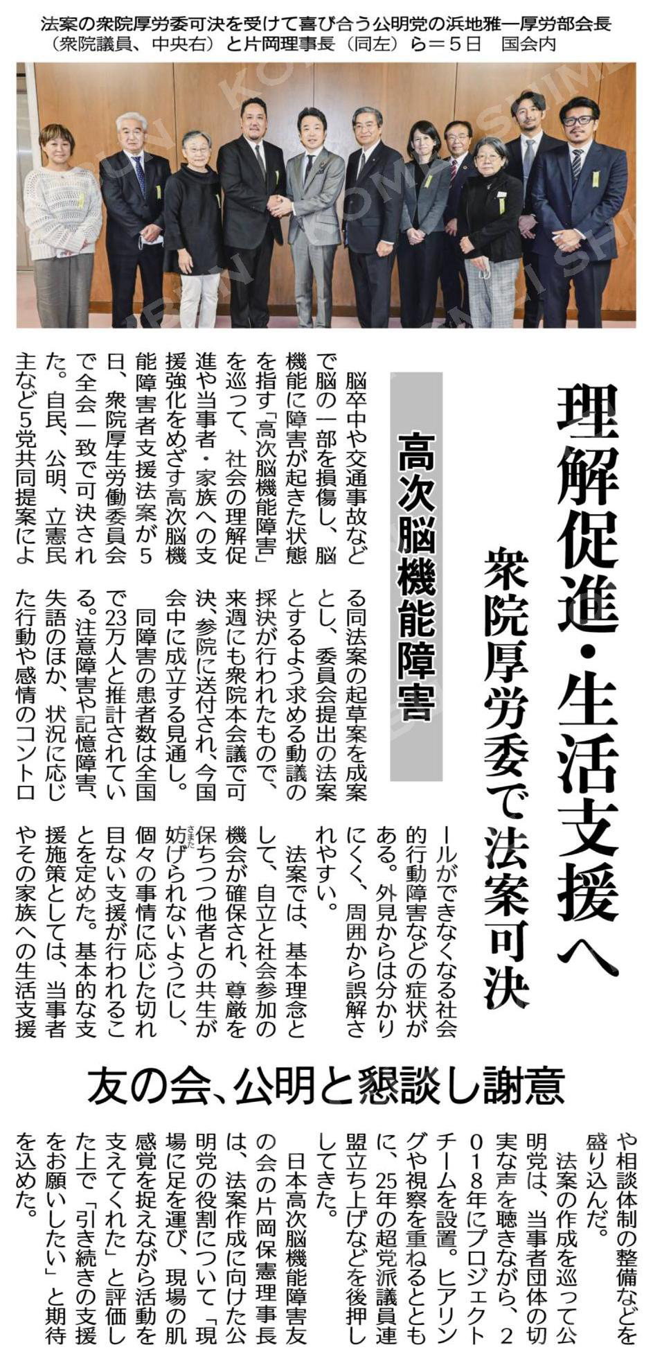 高次脳機能障害に関する社会の理解促進や当事者・家族への支援強化をめざす「高次脳機能障害者支援法」(議員立法)が、16日の参院本会議で成立した。長年にわたり当事者らの切実な声を聴き、超党派議員連盟の立ち上げを後押しするなど、法整備に尽力してきたのが公明党である。